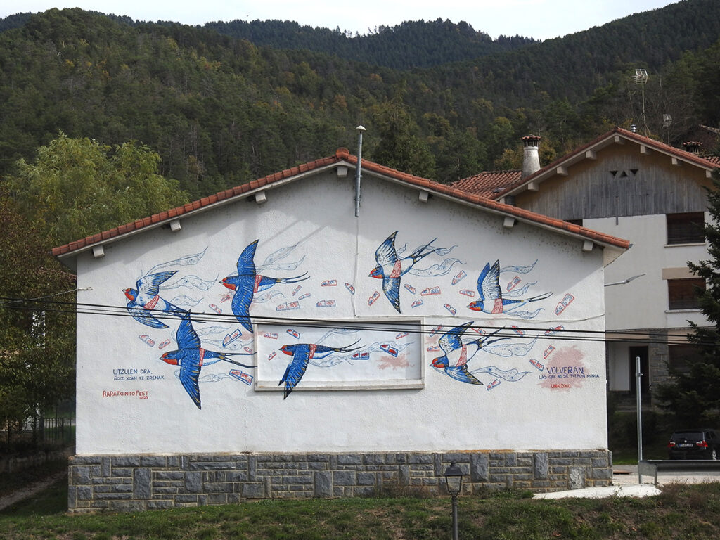 Siete golondrinas juntas, una por cada pueblo,representando al Valle.Engalanadas, luciendo los colores del traje típico de Roncalesa, nos recuerdan la historia de todas esas jóvenes que cruzaban año tras año los pirineos hasta llegar a Mauleón ( Francia ) para trabajar cosiendo alpargatas. Muchas volvieron, algunas decidieron iniciar una vida en Francia…Y otras se apagaron en el camino.