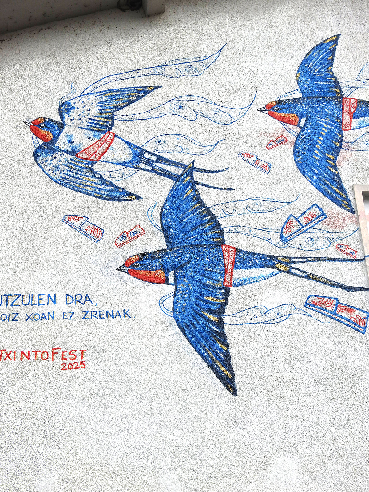 Siete golondrinas juntas, una por cada pueblo,representando al Valle.Engalanadas, luciendo los colores del traje típico de Roncalesa, nos recuerdan la historia de todas esas jóvenes que cruzaban año tras año los pirineos hasta llegar a Mauleón ( Francia ) para trabajar cosiendo alpargatas. Muchas volvieron, algunas decidieron iniciar una vida en Francia…Y otras se apagaron en el camino.