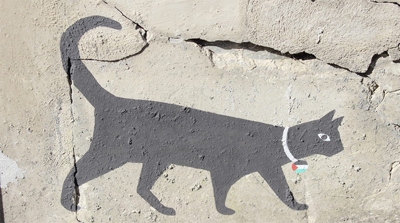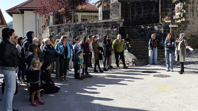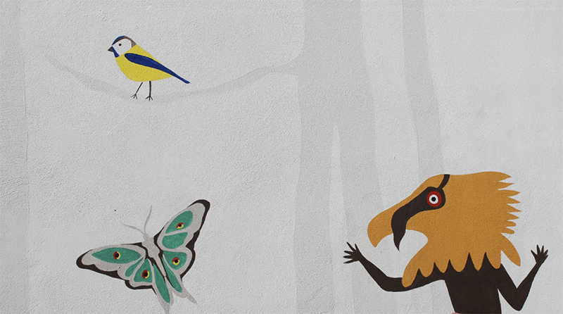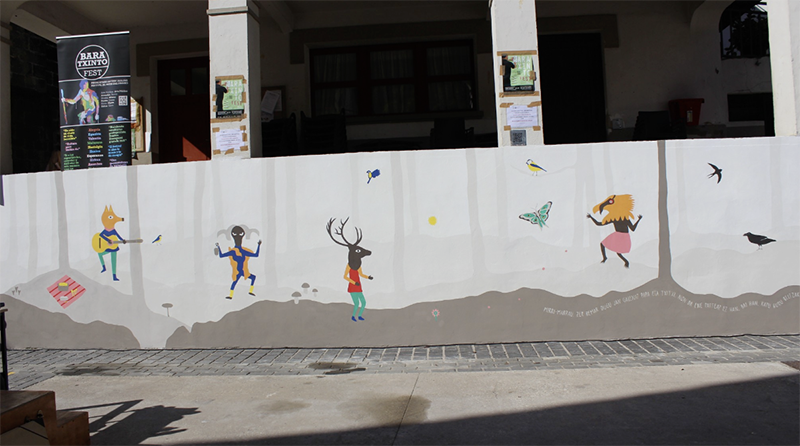 Saliendo del mural hay un gato negro al que sigue una frase o juego infantil sacada de unos de los registros en los que Fidela Bernat habla en euskera roncalés.